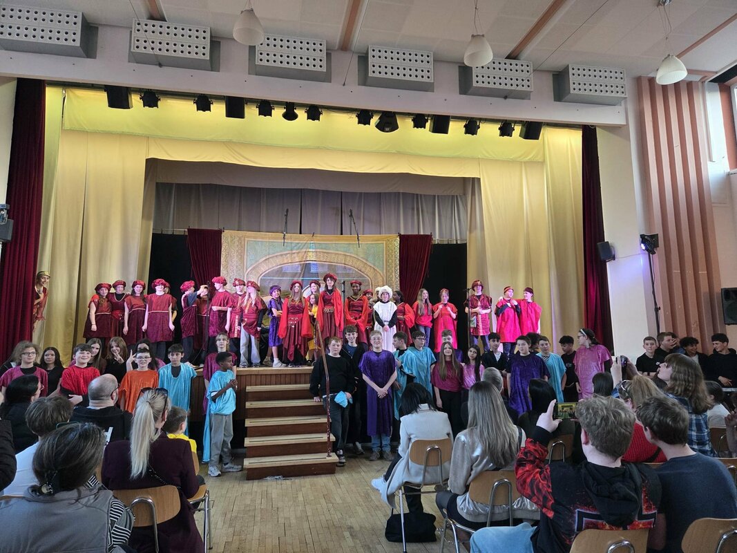 Nachdem drei Tage unter Anleitung die Sprechrollen und der Gesang des Chores intensiv eingeübt wurde, konnten am Donnerstag Hauptprobe und Generalprobe stattfinden. Dort zeigten die Schülerinnen und Schüler, was sie in den vergangenen Tagen gelernt haben. Mithilfe einer Souffleuse wurden auch kleine Hänger im Text überbrückt.