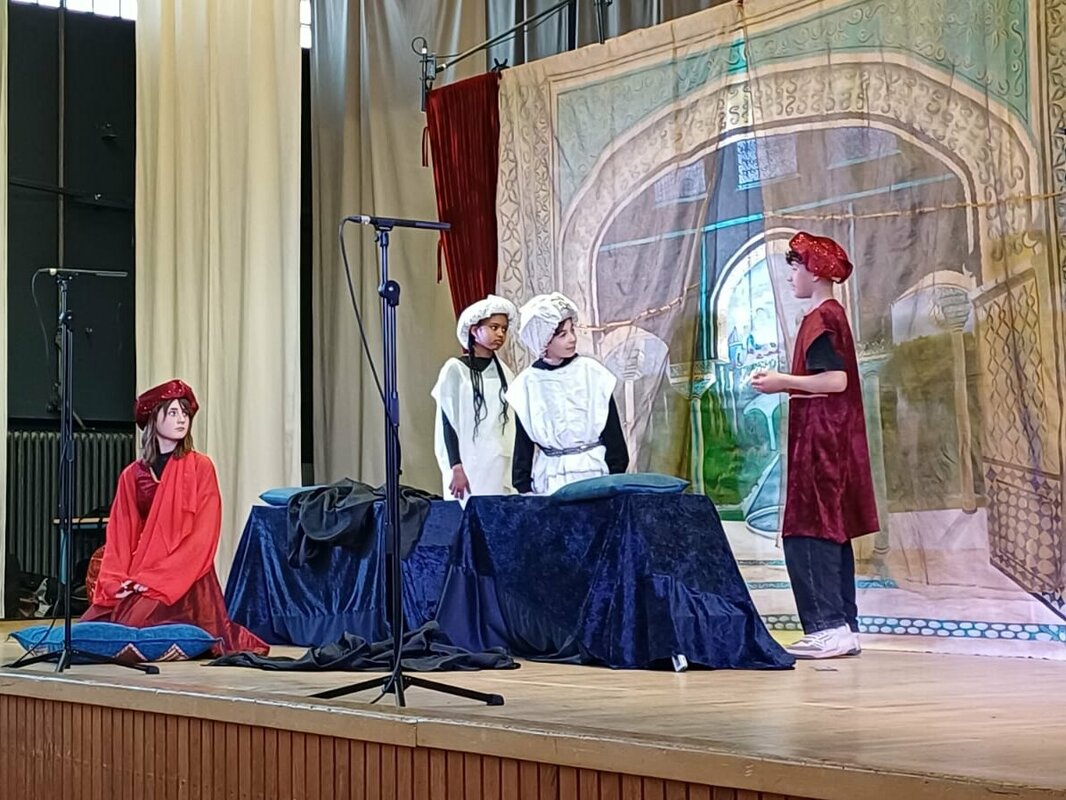Vier Tage wurde geübt, gesungen und geprobt, um am Ende eine verkürzte Aufführung der Oper ‚Abu Hassan‘ von Carl Maria von Weber zu gestalten. Die Klassen 6.1, 7.1 und 7.2 der Herbert-Binkert-Schule haben unter Anleitung der Jungen Oper und deren Mitarbeiterinnen (Link zu Junge Oper) und Mitarbeitern aus Kaletal-Hohenhausen ein beeindruckendes Werk auf die Beine gestellt.